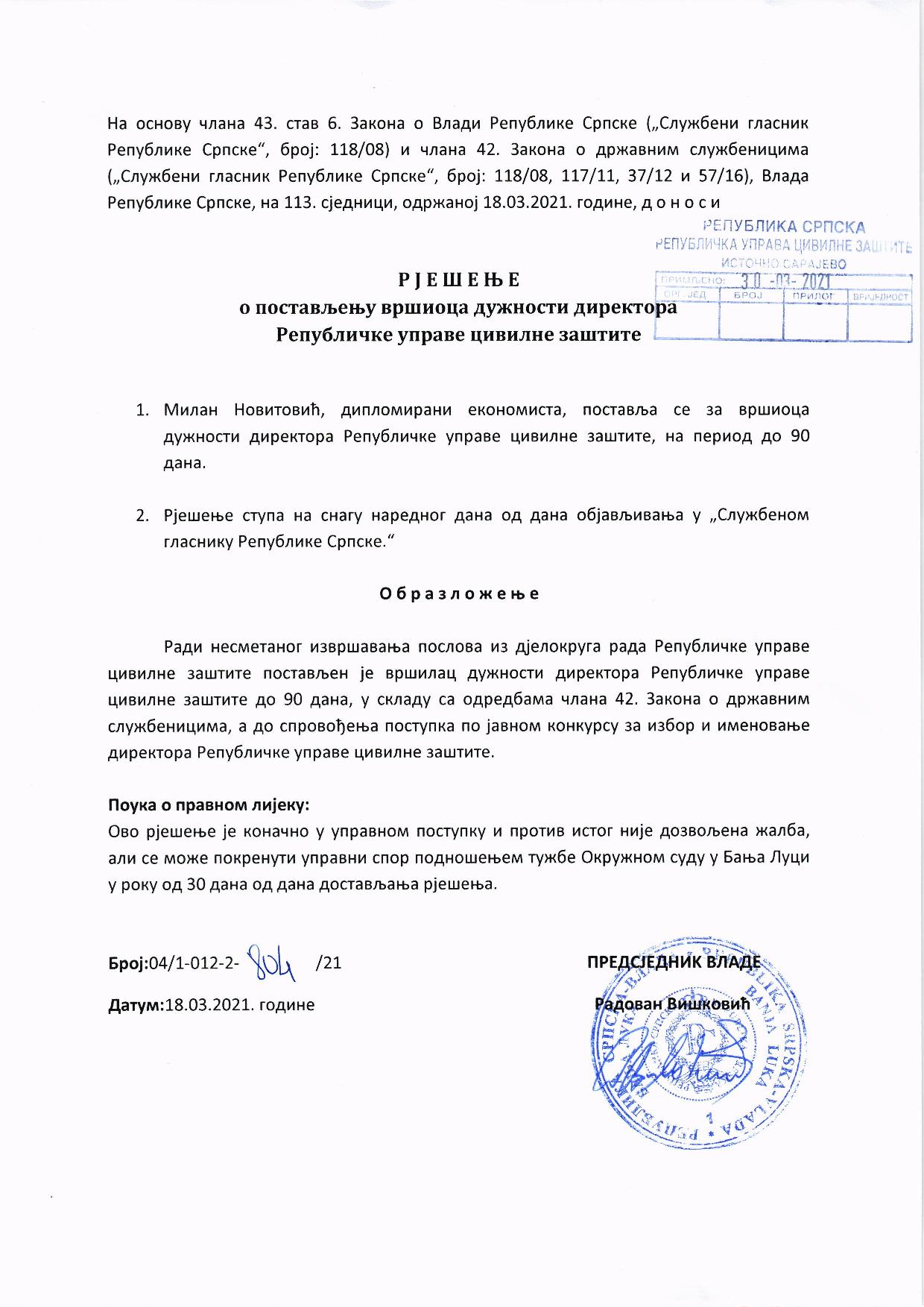 Međutim, presuda za krivično djelo nije spriječila Radovana Viškovića, predsjednika Vlade Republike Srpske da 18. marta ove godine Novitoviću produži mandat na mjestu direktora Republičke uprave Civilne zaštite RS.
