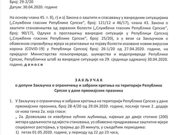U vrijeme policijskog časa dozvoljeno je izvođenje kućnih ljubimaca, ali pod određenim uslovima, odnosno najviše do 200 metara udaljenosti od mjesta stanovanja, uz obavezno pridržavanje mjera socijalnog rastojanja i to u trajanju od maksimalno 20 minuta – navodi se u Zaključku o dozvoli izvođenja kućnih ljubimaca koji je donio Republički štab za vanredne situacije.