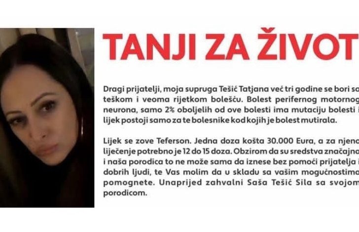 "Lijek se zove Teferson. Jedna doza košta 30 hiljada evra, a za njeno liječenje je potrebno 12 do 15 doza. Obzirom da su sredstva značajna i naša porodica to ne može sama da iznese bez pomoći prijatelja i dobrih ljudi, molim Vas da u skladu sa vašim mogućnostima pomognete", navodi se u apelu.