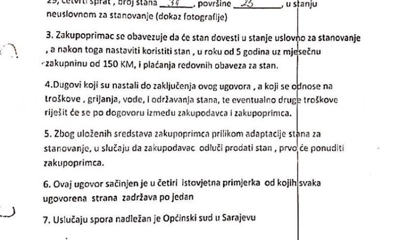 “Zakupodavac (Milan Milidrag) izdaje zakupoprimcu (Gordana Tadić) stan u Sarajevu, u Ulici gradačačka, broj 29, četvrti sprat, broj stana 31, površine 25 kvadrata, u stanju neuslovnom za stanovanje”, navedeno je u ugovoru s potpisom današnje glavne državne tužiteljice.