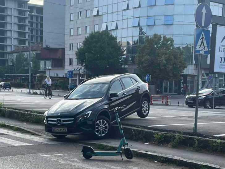 Na fotografiji se jasno vidi da je riječ o vozilu marke Mercedes GLA, koje doslovno "visi" preko ivice parkinga, sa jednim točkom podignutim u vazduh.