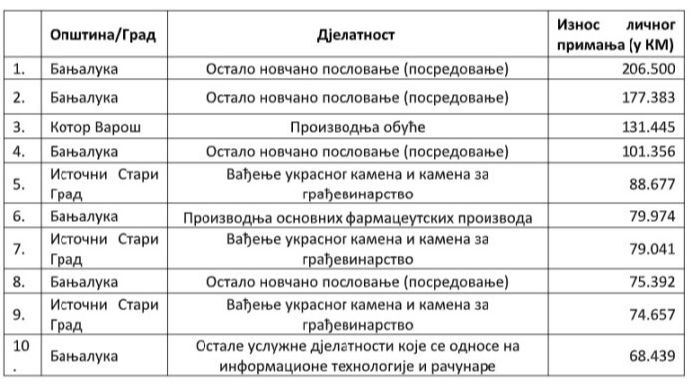 Kada je u pitanju RS, najveću platu u 2022. dobio je Banjolučanin koji radi u oblasti novčanog poslovanja, odnosno posredovanja, u iznosu od 206.500 maraka.