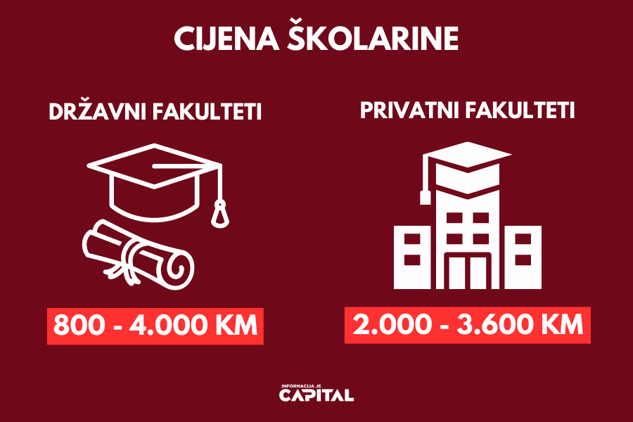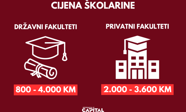 Na privatnim fakultetima je školarina isto najveća stavka. Školarine u ovim ustanovama se kreću od 2.000 KM do 3.600 KM, u zavisnosti od toga koja godina se upisuje i koji studijski program.
