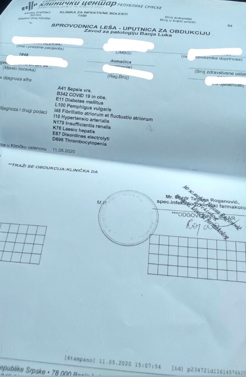 Dana 11. maja kada je pokojnica i preminula, dobio je nalaz sa UKC RS, na kome piše da je uzet bris na COVID-19 sa naznakom – u radu. Među nabrojanim dijagnozama pisao je COVID -19 in obs. a isto to pisalo je i na dopisu koji je Gradsko groblje dobilo od UKC RS.