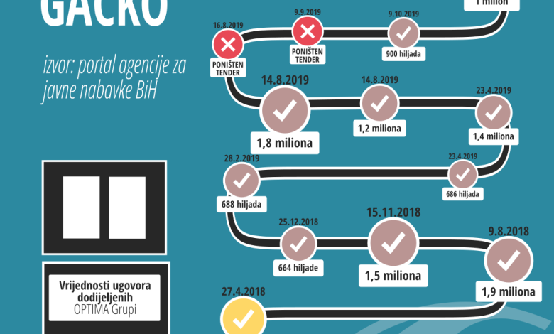 Informaciju o ovakvom ponašanju ovog ugovornog organa TI BIH je objavio u julu prošle godine jer je od 2015. do tada Optima Grupi dodijeljeno oko 25 miliona KM. U međuvremenu poništen je još jedan postupak a Optima Grupa dobila je još tri ugovora vrijedna oko 4 miliona KM zbog krajnje hitnosti.