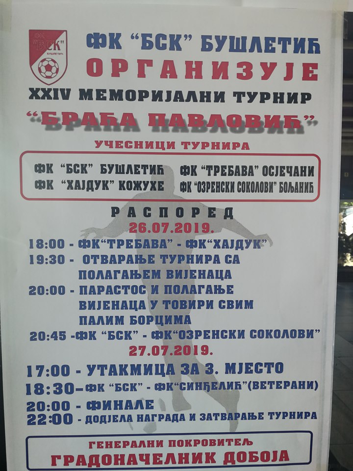 Fudbalski klub “BSK” Bušletić organizuje 24. Memorijalni turnir “Braća Pavlović” u Bušletiću, koji se igra u petak i subotu 27. i 28. jula na terenu FK “BSK” Bušletić.